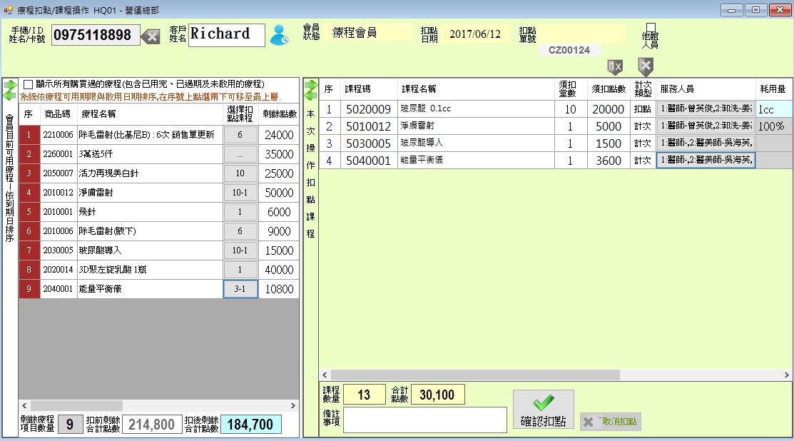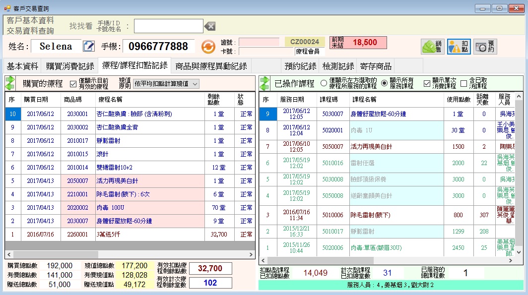 詳細紀錄客戶所有交易紀錄:消費、扣點、剩餘儲值、療程異動、預約紀錄等