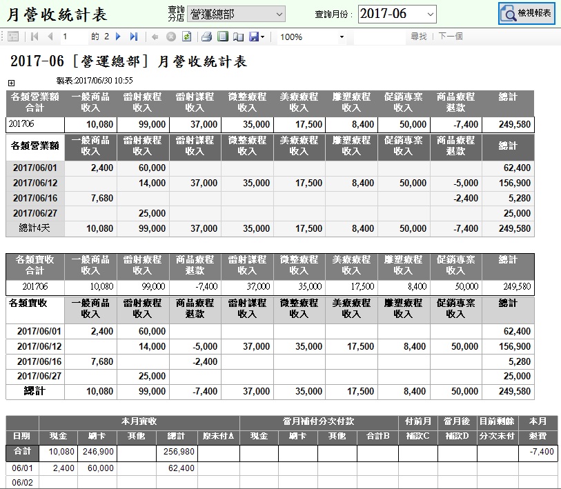 當日客戶消費金額/付款方式/承辦業務、各類收入類別總額以及每位服務人員服務明細,以及新客/舊客分別消費總額等資訊