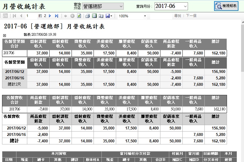 當日客戶消費金額/付款方式/承辦業務、各類收入類別總額以及每位服務人員服務明細,以及新客/舊客分別消費總額等資訊