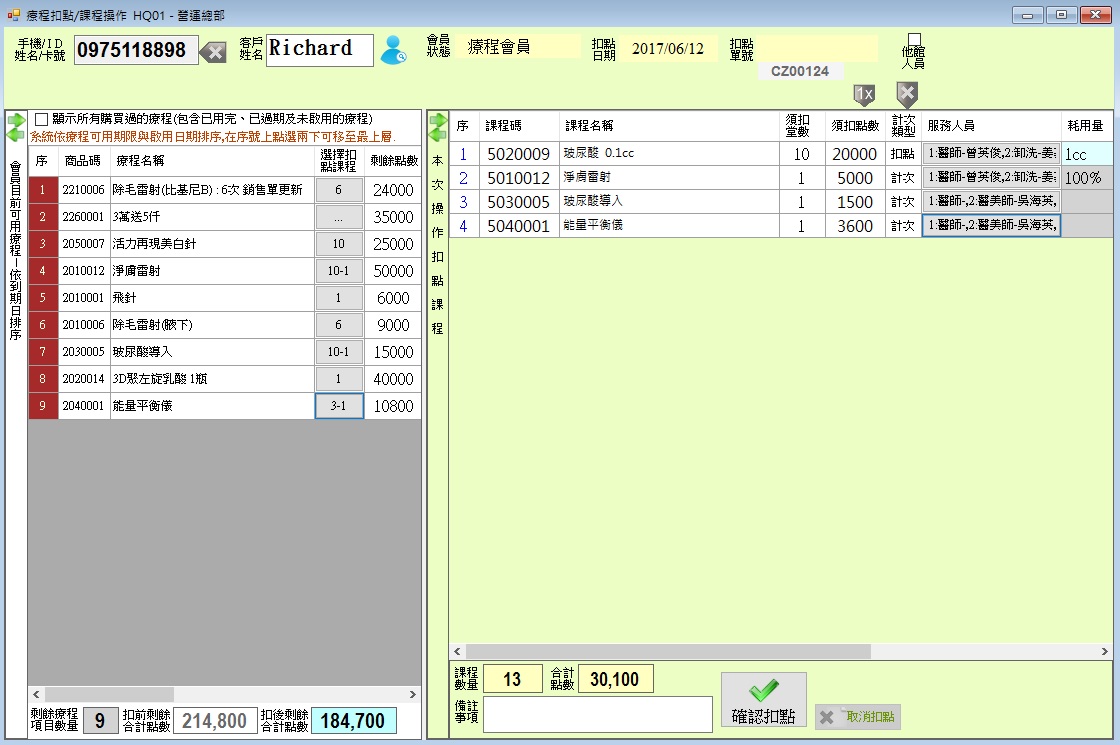 詳細紀錄客戶所有交易紀錄:消費、扣點、剩餘儲值、療程異動、預約紀錄等